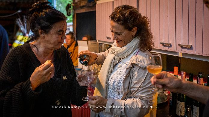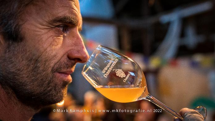 Een glaasje gif? Niet bij Dassemus. De oranje wijn bijvoorbeeld wordt gemaakt van witte druiven maar met schilweking zoals bij een rode wijn en behoeft daardoor ook geen sulfiet. "Het is een hele oude manier van wijn maken. Een paar honderd jaar geleden kon witte wijn niet bestaan. Zonder sulfiet zou het bederven. Maar als je de schillen mee gist, geven die tannine af, een natuurlijk conserveermiddel. Het is heel fruitig, maar superdroog op de tong. Een combinatie van frisheid, floraal en structuur. Proost!" Glazen gaan naar de mond. De reacties zijn gemengd. Langeveld verdedigt zich: "Het is wel even wennen, maar heel populair." Met een knipoog: "In Amsterdam."