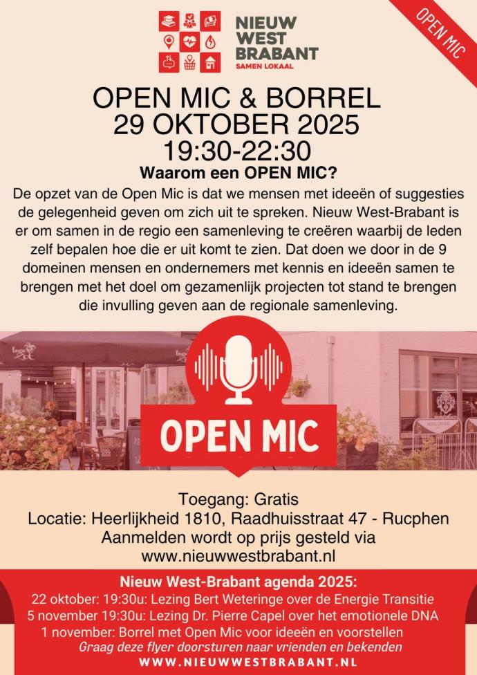 De locatie is open vanaf 19:00 uur en we beginnen om 19.30 uur met de Open-Mic. De opzet van de Open-Mic is dat we mensen met ideeën of suggesties voor Nieuw West-Brabant de gelegenheid geven om zich uit te spreken.