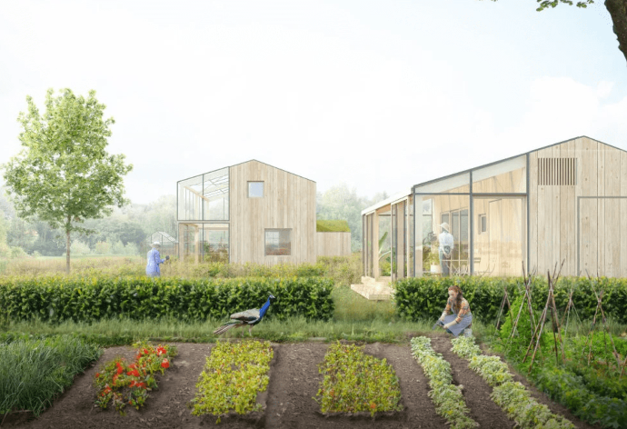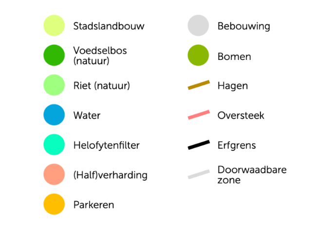 een wijk van 30 klimaatadaptieve en klimaatpositieve huurwoningen, 6 mantelzorgwoningen, buurthuis, kennis- en educatiecentrum, werkplaats en kantoren, met mogelijkheden voor onze eigen voedselvoorziening, onze eigen energievoorziening, ecologische waterzuivering en duurzame ondernemingen.