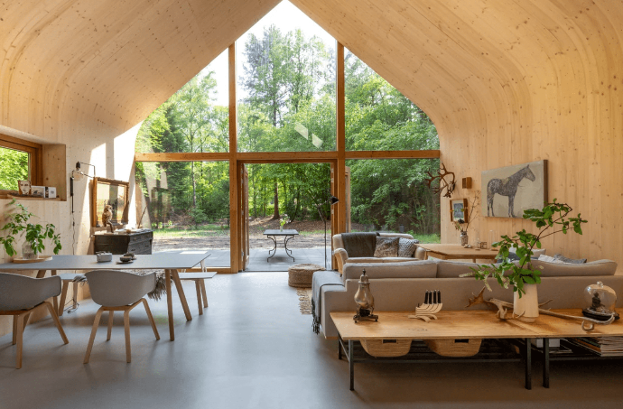 Bouwen/verbouwen op een milieuvriendelijke manier: De woning wordt bijna volledig voltooid in de loods.
