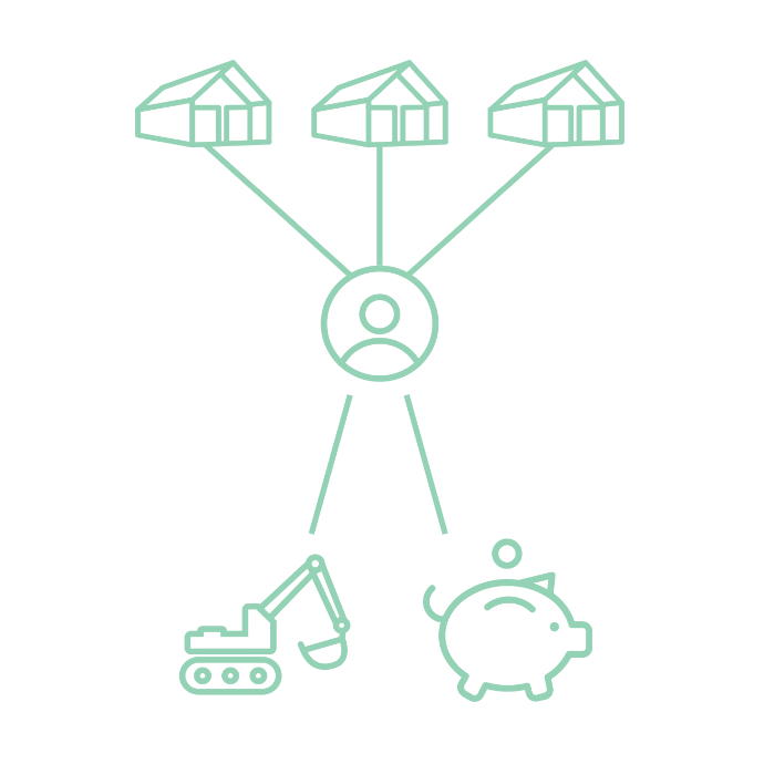 Alle kavels vormen samen één geheel. Er wordt een onderscheid gemaakt tussen je eigen kavel en de gemeenschappelijke voorzieningen. De grootte van je kavel is afhankelijk van welk type woning je kiest. In samenspraak met de landschapsarchitect ga je jouw eigen kavel indelen.